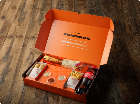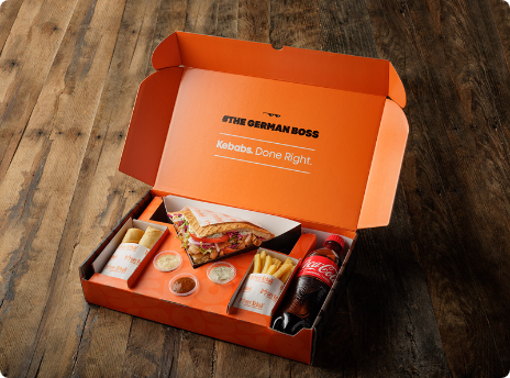 The Boss Box for one. Original German Doner Kebab, served with a portion of our Crispy Doner Roll or a side of Fries, 3 Signature Sauces and a Beverage.